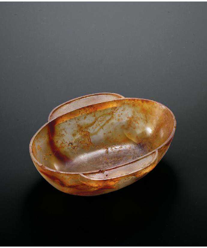 玛瑙质,选料上乘,透光明亮,布有黄褐色斑纹。杯体呈椭圆形,直口,收腹,椭圆形圈足。两侧各饰半月形耳,线条纯朴简洁,刀法流畅。通器光素无纹,以玛瑙本身材质表现空灵通透之感。整器造型古朴典雅,抛光柔和圆润,掏膛乾淨清晰,体现极佳的工艺水准。