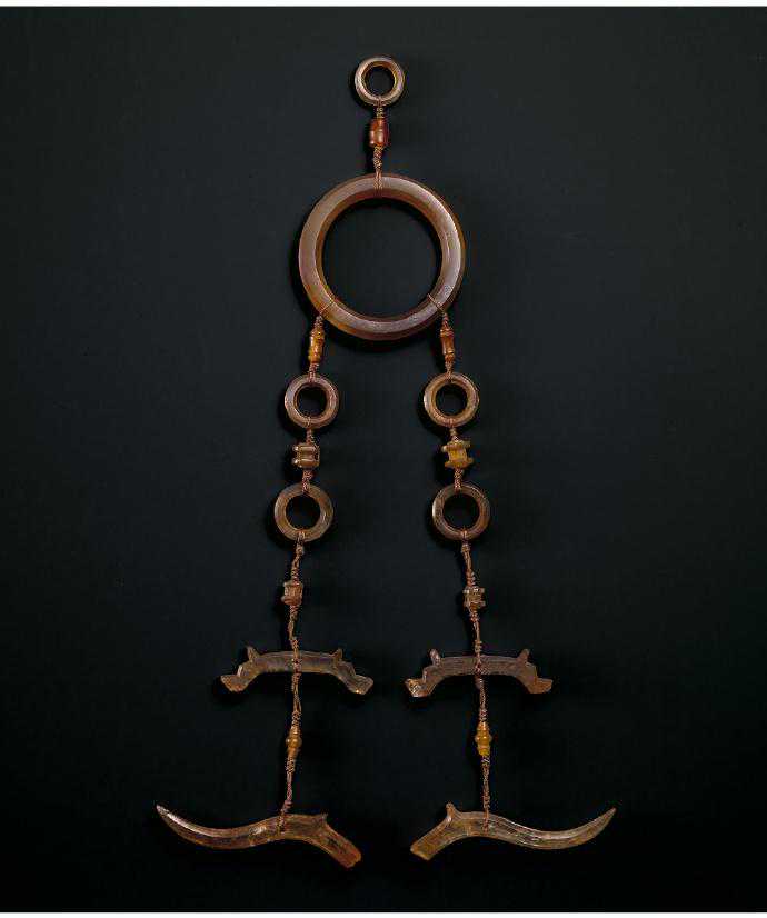 组珮饰以水晶及玛瑙为材,质地淨透,光泽莹润。环和龙形珮饰组成,搭配协调,用料讲究,琢製细腻。环製作规整,洁淨明亮,龙形饰体形修长,曲体尖尾,头部凸出一角,极富动感。