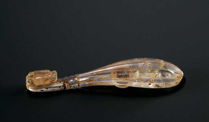 水晶质,晶莹通透,带浅褐色沁,增添古朴风韵。带钩分钩首、钩钮、钩身三部分。钩首作龙首状,方脸凸吻,粗眉圆眼,龙嘴方阔,威严庄重。钩身成琵琶形,饰瓦沟纹,背面有一圆形钩钮。整器造型别致,气韵生动,是件难得的汉代带钩佳品。