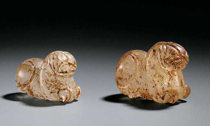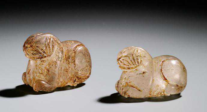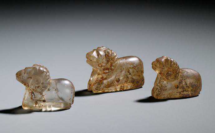 羊三件一组,以水晶为材立体圆雕而成,作俯卧状,身躯饱满,昂首挺胸,头部呈三角形。鼻吻窄而前凸,抿嘴。双角施螺旋纹,回捲贴于羊首两侧。前腿跪地,后腿弯曲前伸,蹄趾分明,底部平素无饰。羊身有一横孔,可供穿繫。