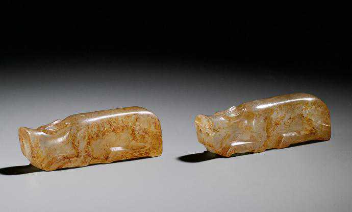 猪一对,以水晶为材雕成。对猪呈俯卧状,短吻小耳,身略长,四足收于身下,雕刻精细,轮廓分明。本器刀法简洁俐落,仅仅数刀便将握猪閒适姿态表现无遗,简练中却不失淳朴可爱,极为讨喜。