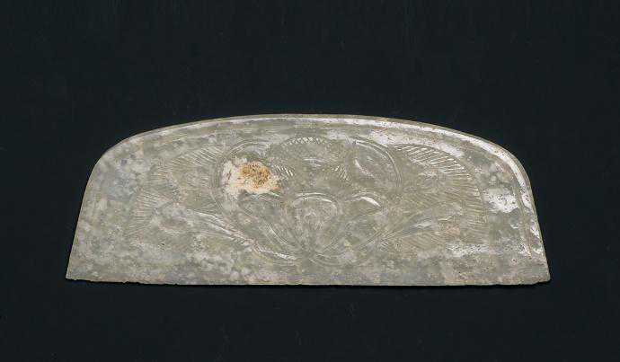 梳篦二件,片状,半月形横梳,上部呈弧形,下部较宽平。随形开光内,两面均浅刻花纹,阴线细密整齐。一为青白玉製成,淡青色泽,质地温润,满布白色斑点,含蓄柔美。边框内刻划盛开花朵,其旁衬托多层宽厚叶片,内饰细阴线,下部较宽平刃边;另一为象骨製,在随形开光内减地隐起花卉纹,底饰细密菱形格纹。其下雕梳齿数十根,排列整齐緻密。细观本组玉与骨梳篦,刻划精緻,器身纤薄,应是置于头部之饰物。