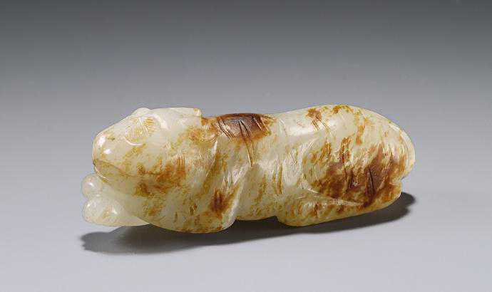 白玉质,莹润凝脂,光华隐隐,局部褐色斑纹沁。虎呈俯卧状,以阴线刻划五官,神情温顺。双耳后贴,四肢俯卧于腹下,前肢交叠于颏下,长尾翻捲至腹侧,灵动可爱。背部有线刻纹样,刀工俐落。工匠因材施艺,藉玉材天然色泽纹理,巧作为虎身之斑纹,手法写实,形象生动。