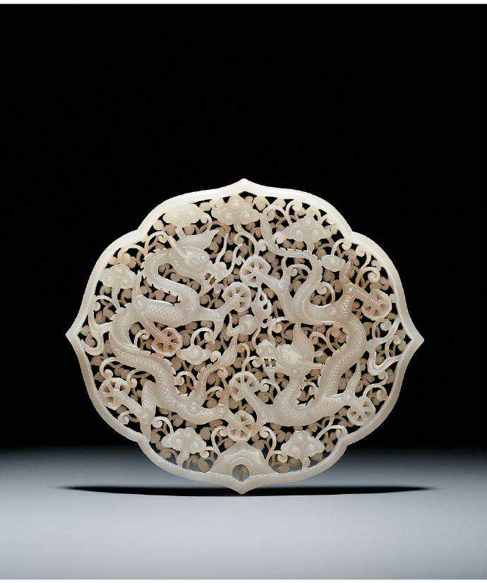 白玉质,纯淨润泽,局部微有淡褐黄色泽。珮呈海棠形,镂雕双层纹样,表层雕双龙相望,龙身如蛇,曲折细长,蜿蜒扭转。鼻呈如意形,龇牙裂嘴,头顶双角,鬃髮向上飞扬,身躯以阴线刻划格状纹表示鳞片,关节处雕螺旋纹。旁有祥云相伴,底层雕卷叶纹,繁密有度。整器雕刻细腻,双龙姿态灵活,栩栩如生,充满富贵盈瑞之气。