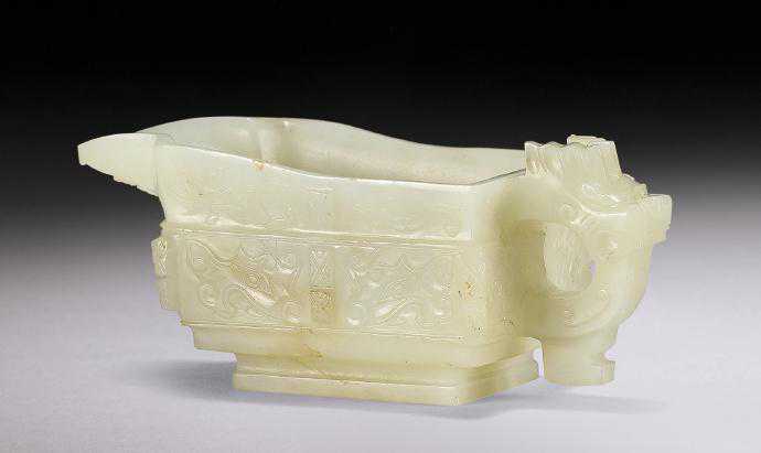 白玉质,包浆温润,莹洁凝光。器仿古商周青铜器匜形制与装饰特徵,再加以融合创新。匜呈扁长方身,下承方足,一侧为流,另侧雕琢龙形单耳。内胫光素,打细滑。外壁施浅浮雕技法,流琢四出戟,流嘴饰夔凤纹及夔龙纹。腹琢八出戟,主题饰兽面纹,柄作龙首,苍龙双角,双眼圆睁,狮鼻平吻,霸气十足。