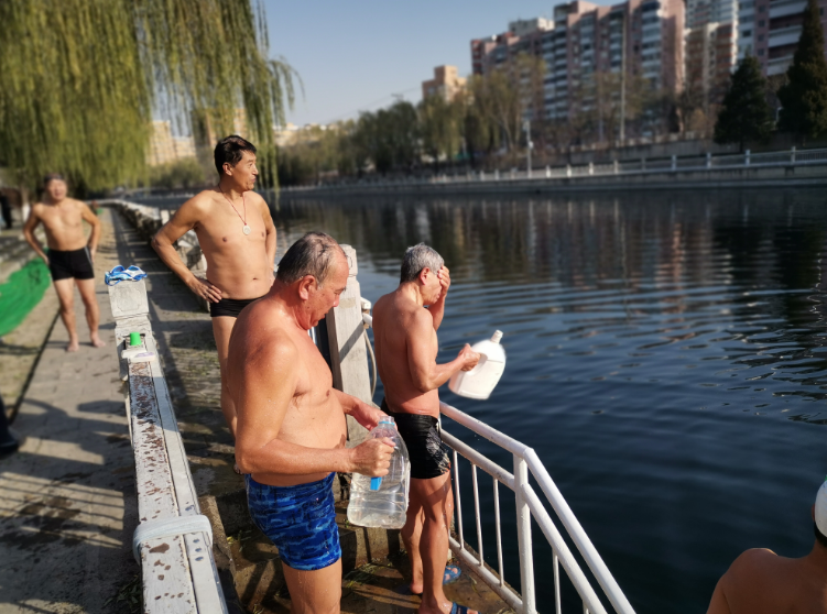 周末上午10点,在龙潭公园东门外的护城河边,东城区群星冬泳队队长孙振海指了指头上的天,招呼着身旁的老伙计们:“等着太阳再转过来点儿,就可以下水喽。”