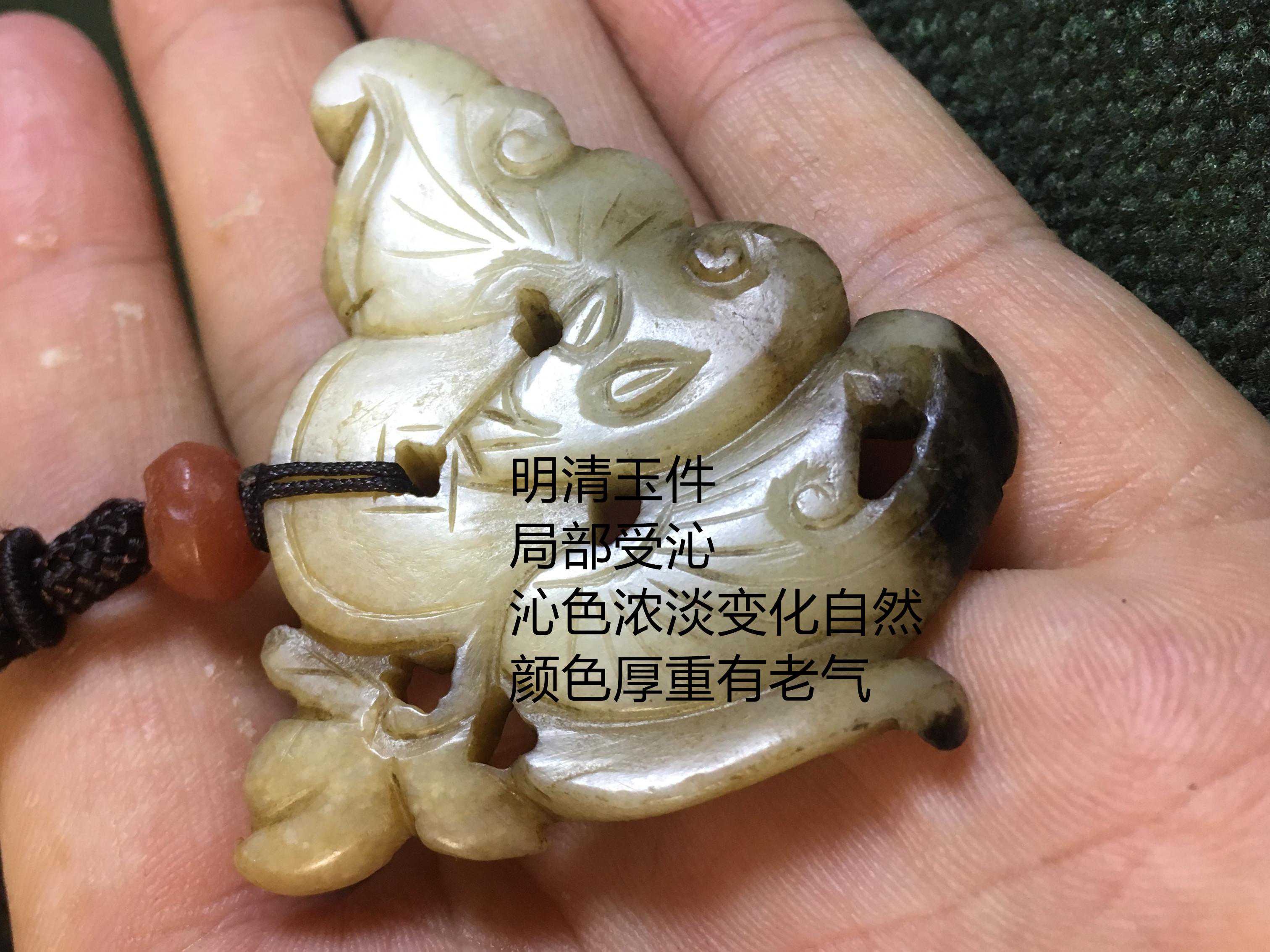 很多的伪沁色都是浮在表面,透光看会有轻浮感,而且沁色不够厚重,没有历史岁月感。还有就是假的沁色杂乱无章,过渡层次感上非常的生硬不自然,颜色艳丽。还有很多用玉料自带的杂质料做伪沁,做出深入玉骨的感觉,知道这种做伪方法后,注意区分是否是杂质就可以了,还是比较好区分的。另外配合上玉质的老熟度,特别是受沁的地方,比没有受沁的地方老熟度要高,这个也是仿品做不出来的,仿品所用的料子都很生硬,整体熟度差不多没有什么变化。