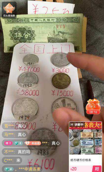 “有多少人家里的硬币是按斤卖的,如果是的话,你就亏大了。”某自称从事钱币收藏多年的主播建议观众,拿出家里的硬币看看年份和特征,等待他们“上门回收”。而当有观众询问如何联系时,她才说需先购买一份钱币价格表,而后通过私信功能,直接发给她地址。“抢到价格表才能给我发上门地址,没有抢到价格表就不行。”