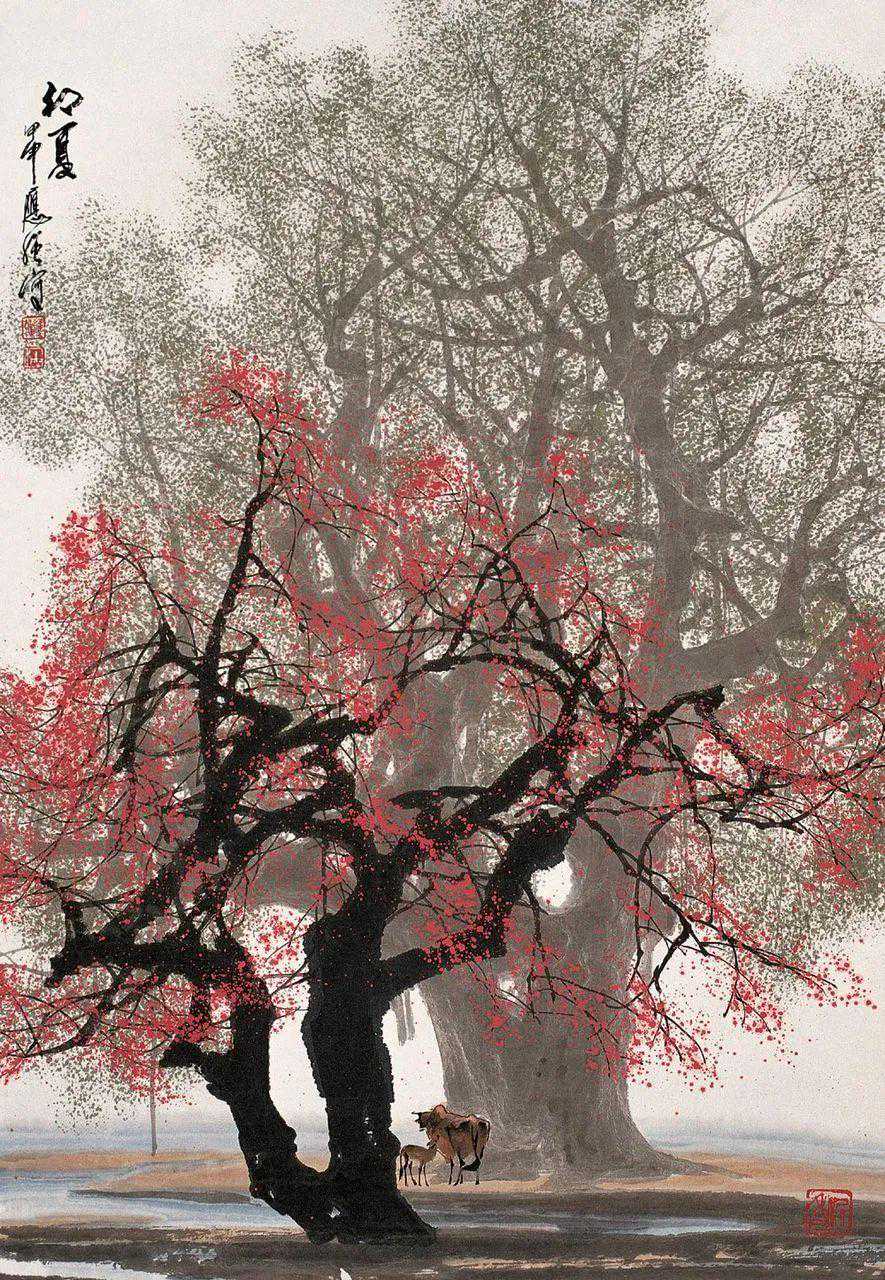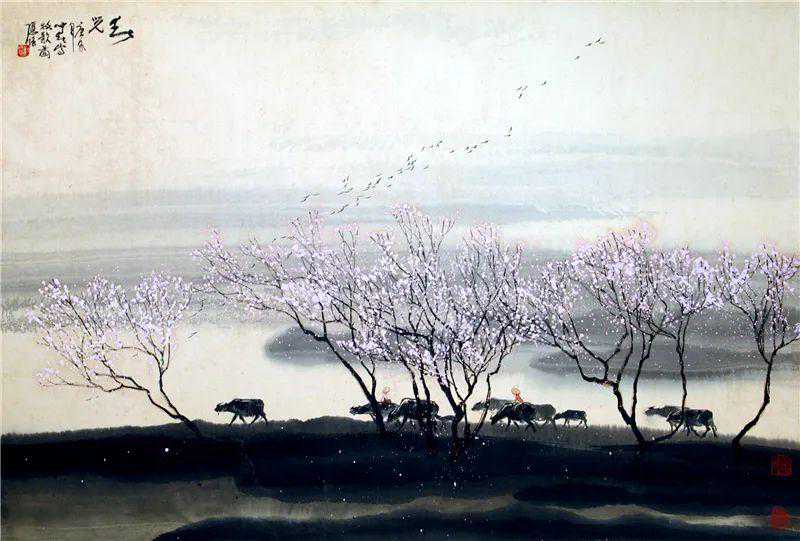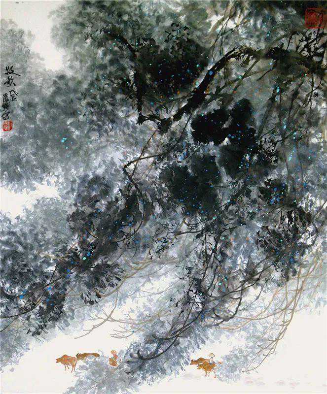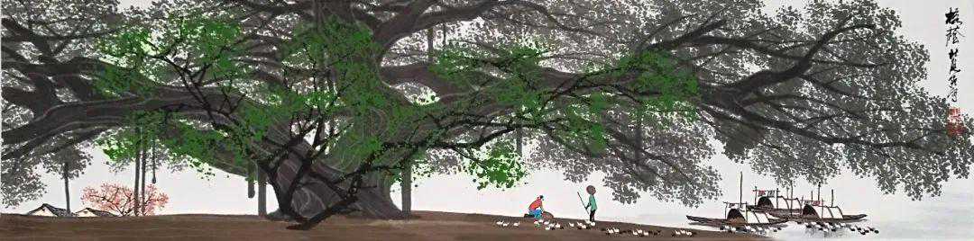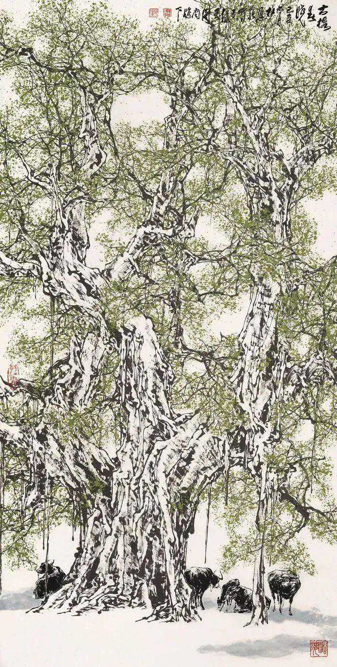 得益于版画的空间层次,他的水墨画境界比一般传统水墨画更显得幽深。他画的《归牧图》《春雨濛濛》《春江水暖》《韩江两岸古榕多》《清辉》《林间》等佳作,都境界幽深,诗意葱茏。他的水墨画不仅画出了榕树的灵魂,而且画出了画家自己的精神。