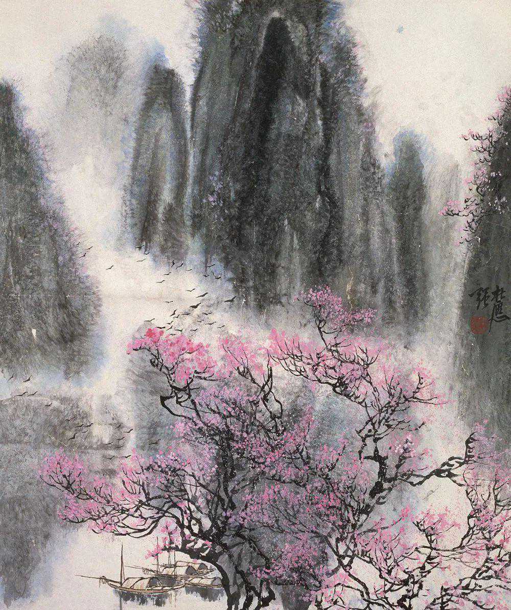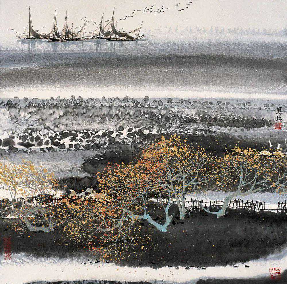 这些水墨作品格调柔和、雅致、大方,给予人以和谐感与悠闲感。这些感觉既是画家在大自然中获得的启发,也是他内在平静心态的反映。