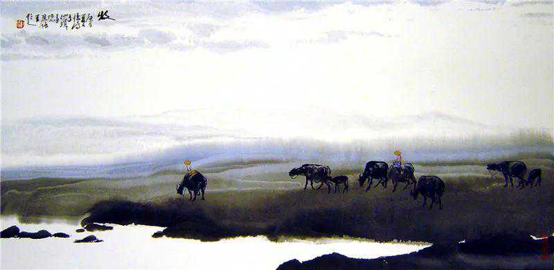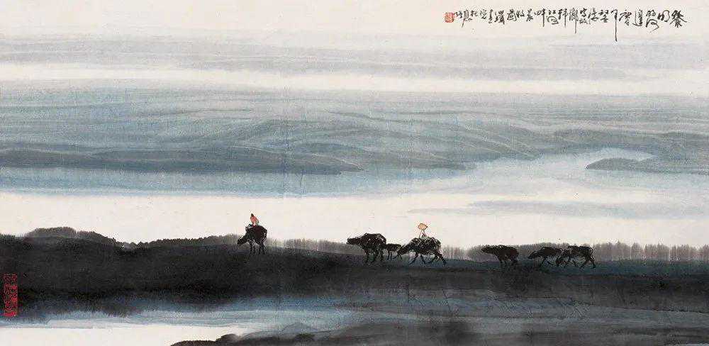 在全面掌握笔墨效能的基础上,杜应强把探索的重点放在墨的运用上,同时充分发挥它的效果。画面上盘根错节、枝叶繁茂的榕树占主体位置,榕树枝干体面之间的边线由淡墨映现出来,墨色在柔和的调子中有微妙变化。与榕树形成对比的多是边线轮廓较为清晰、墨色较浓和黑白对比较为强烈的水牛(有时还有骑在牛背上的农人),或者是由较浓墨色画成的地面。画面敷以淡彩,墨与色融为一体,在统一气氛中有变化、有灵动。
