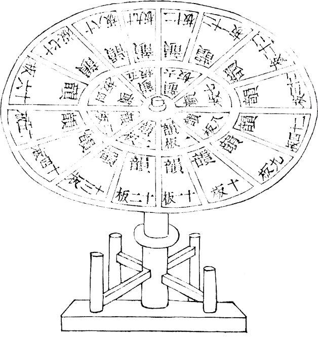 “造轮法:用轻木造为大轮,其轮盘径可七尺,轮轴高可三尺许,用大木砧凿窍,上作横架,中贯轮轴,下有钻臼,立转轮盘,以圆竹笆铺之。上置活字板面,各依号数,上下相次铺摆。凡置轮两面,一轮置监韵板面,一轮置杂字板面。一人中坐,左右俱可推转摘字。盖以人寻字则难,以字就人则易。以此转轮之法,不劳力而坐致字数。取讫,又可铺还韵内,两得便也。