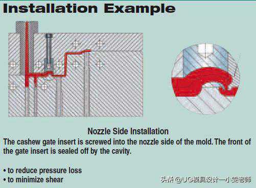 图1所示为DMS最新研发的潜定模的结构图,其尺寸见图2.潜伏式入水(sub-gate)和牛角入水(Cowhorngate)的便利性,促进了模具标准件的研发和应用,图3为DMS最新研发的牛角入水镶件。