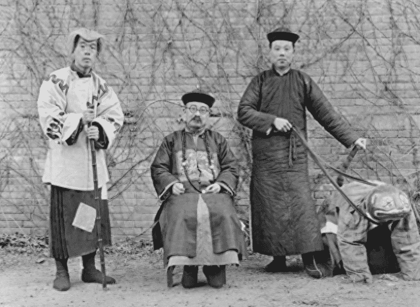 那位身着华丽官服、佩戴着朝珠的人应该是清朝四品以上的高级官员