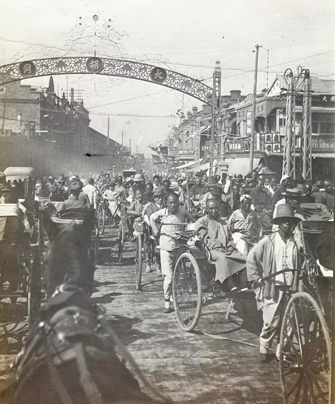 1914年,天津金刚桥上繁忙的交通。黄包车是当时最为常见的交通工具了。