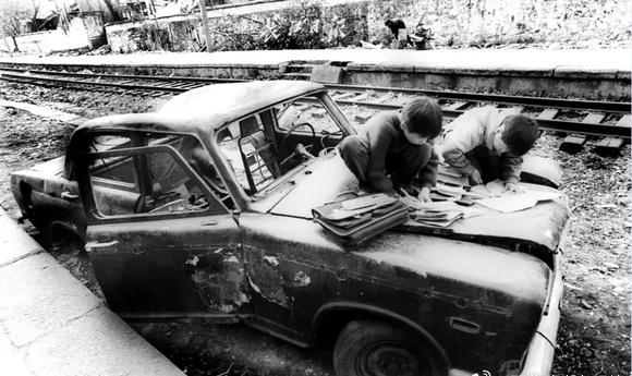 1997年1月,武汉,放学的孩子在大智路汉口老铁路路边丢弃的小汽车车顶上做作业。