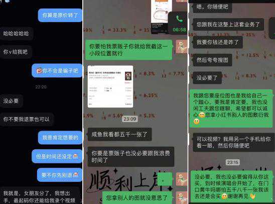 演唱会前夕,骗子谎称已买到票但家中有事去不了,或者跟前任分手“含泪转让”,在一些二手交易网站搭讪受害者售票,拿到钱就拉黑。
