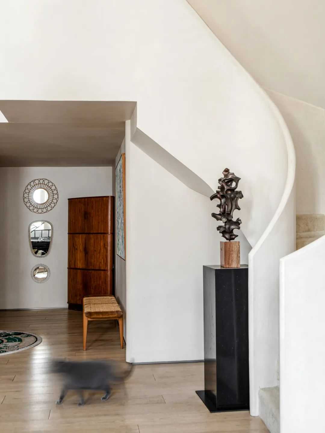 其中,一层配备画廊级别的拉膜灯箱吊顶,用来陈列家里面放不下、但两人又想时刻看到的作品,韦晴会依据自己的心情随时调换它们;二层是客厅与餐厨区,中间用来自捷克的镂空屏风划分,餐柜是从巴黎圣图安跳蚤市场收来的古董牙医柜;三层主要是卧室空间,路易威登经典Wardrobe箱子被韦晴用来挂丝巾、手套等配饰,两个宝宝的儿童房里设置了一条游戏“盒子”密道可以直通三层阁楼。