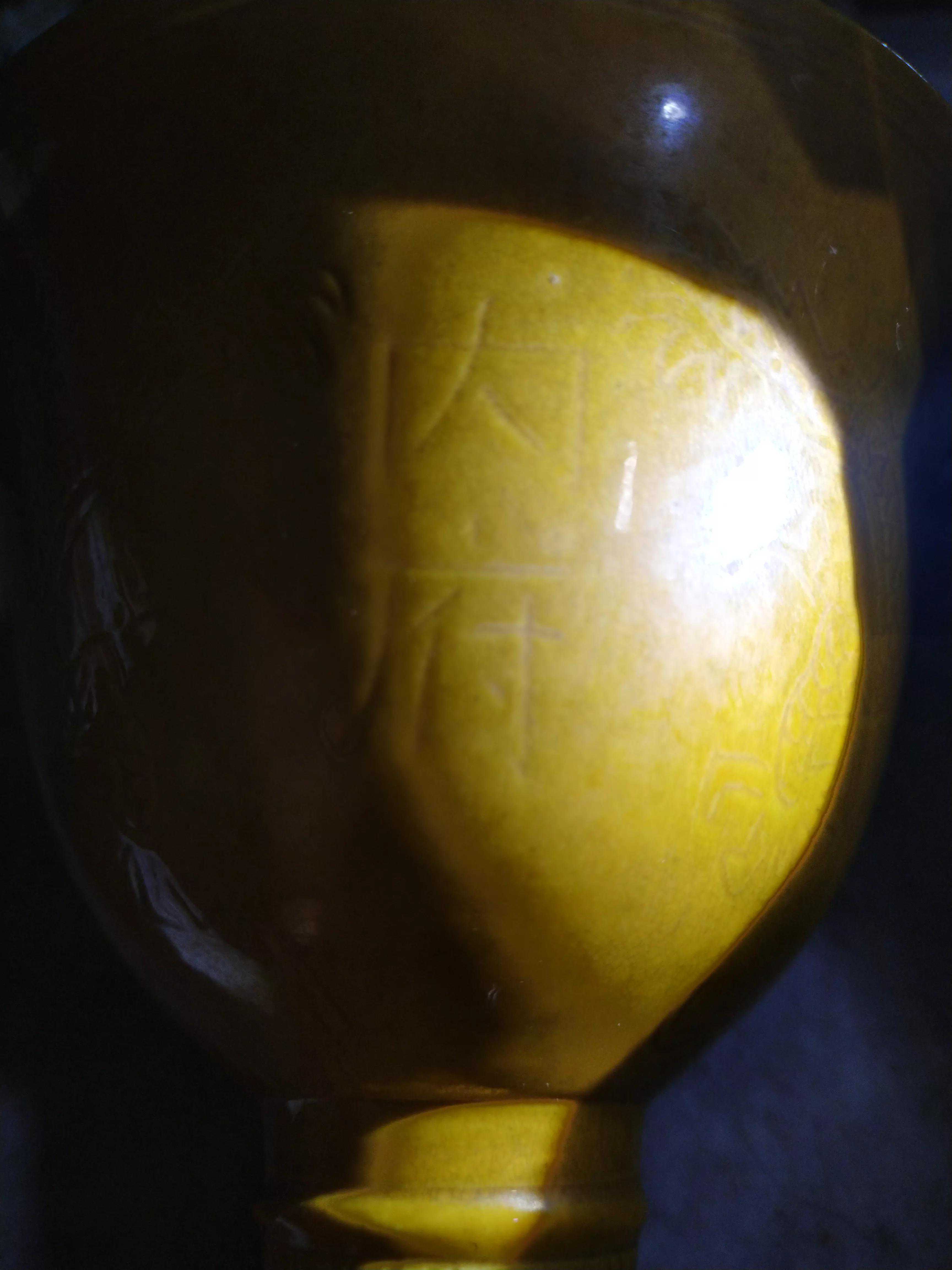 偶得嘉靖黄釉杯,杯外壁暗刻五爪龙纹,暗刻“内府”二字,杯柄暗刻芭蕉纹饰。薄胎黄釉,呈半透明。底款书写规整,白釉亮白。