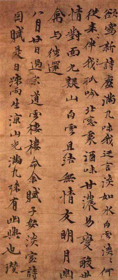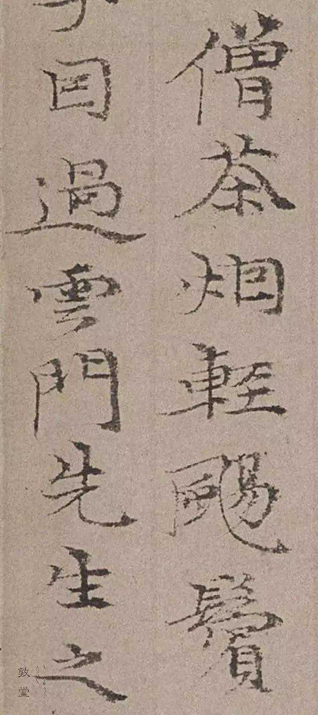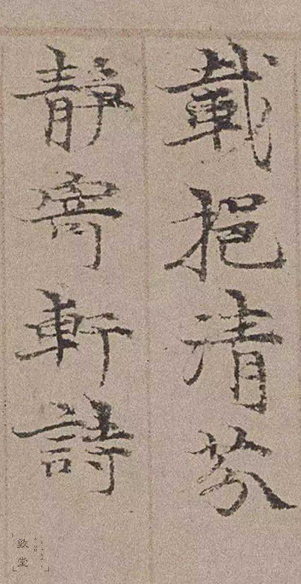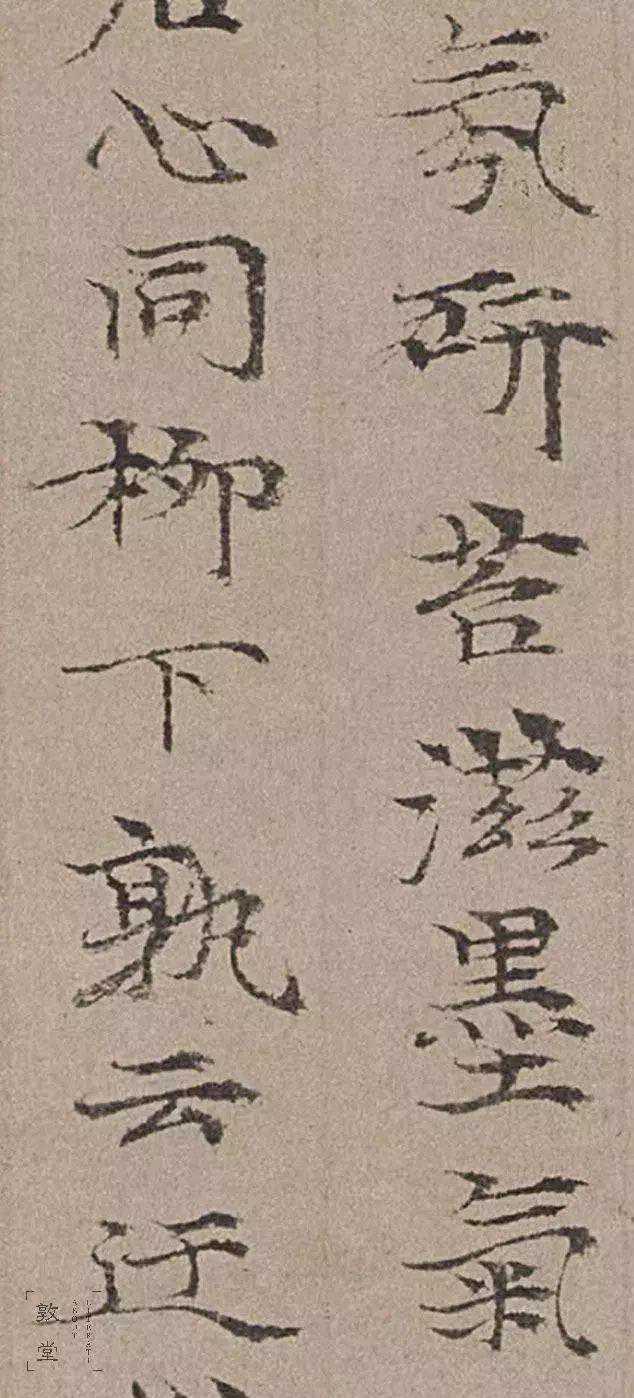 倪瓒小楷字形没有唐楷的中规中矩,无论是单个字,还是整幅作品的字里行间,均参差错落,字形的大小变化也比较大,临写时除了要注意参差错落之外,避免将字形写的大小一律,同时还要注意其单个字和整幅作品在行列和字距之间的关系,使作品的气象更为灵动。倪瓒小楷的纵向笔画多呈向背关系,这种特征在他的小楷作品中经常见到,其结果是字体向上向下呈开势状态,所以,倪瓒小楷字的左下、右下的笔画一般都比较长,有些字在没有竖向笔画的前提下,依然会通过延伸左下、右下的笔画来造势。倪瓒小楷左右结构的字,中间都有很大的空间,这样能产生疏密对比的视觉效果,而按照正常的写法是不可能的。倪瓒小楷作品的章法,也颇有特色,字距相对较紧、行间距离则相对较宽,疏密有致,加上其用笔的干净利落、清晰灵动,整篇作品颇显淡雅清新之气。