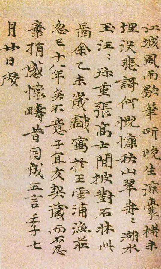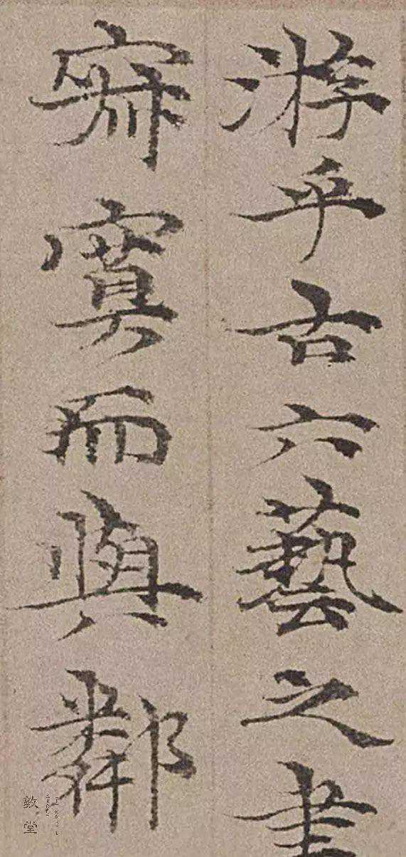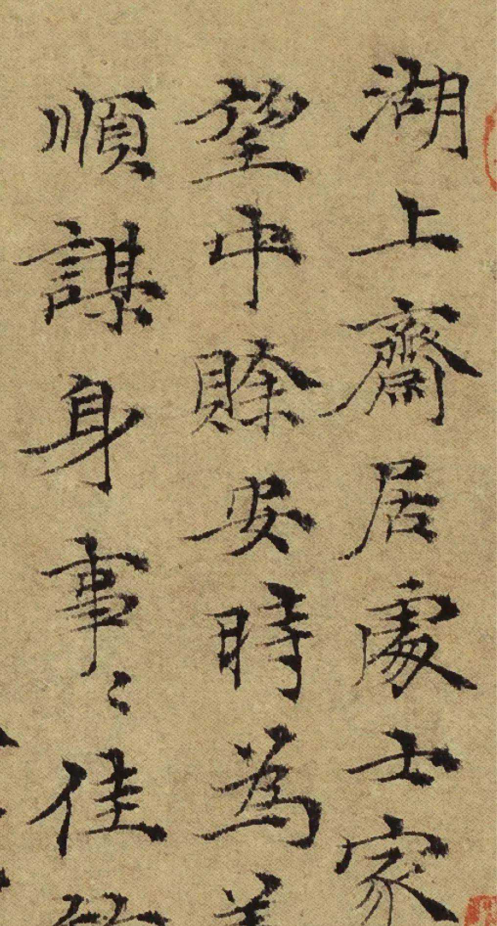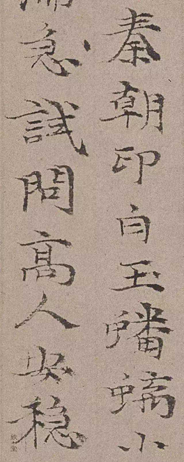 倪瓒小楷字形没有唐楷的中规中矩,无论是单个字,还是整幅作品的字里行间,均参差错落,字形的大小变化也比较大,临写时除了要注意参差错落之外,避免将字形写的大小一律,同时还要注意其单个字和整幅作品在行列和字距之间的关系,使作品的气象更为灵动。倪瓒小楷的纵向笔画多呈向背关系,这种特征在他的小楷作品中经常见到,其结果是字体向上向下呈开势状态,所以,倪瓒小楷字的左下、右下的笔画一般都比较长,有些字在没有竖向笔画的前提下,依然会通过延伸左下、右下的笔画来造势。倪瓒小楷左右结构的字,中间都有很大的空间,这样能产生疏密对比的视觉效果,而按照正常的写法是不可能的。倪瓒小楷作品的章法,也颇有特色,字距相对较紧、行间距离则相对较宽,疏密有致,加上其用笔的干净利落、清晰灵动,整篇作品颇显淡雅清新之气。