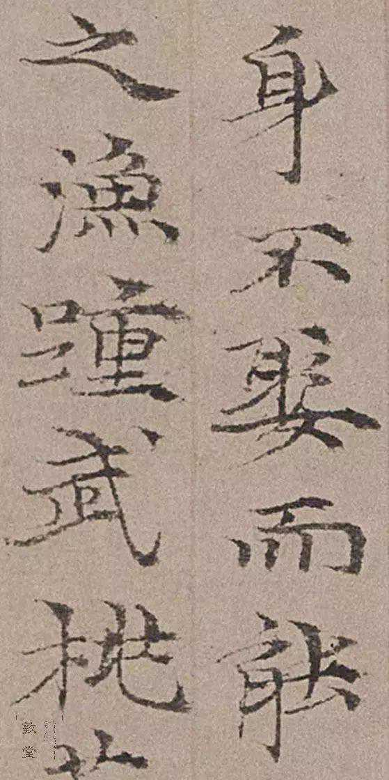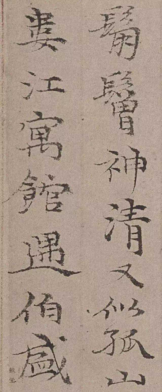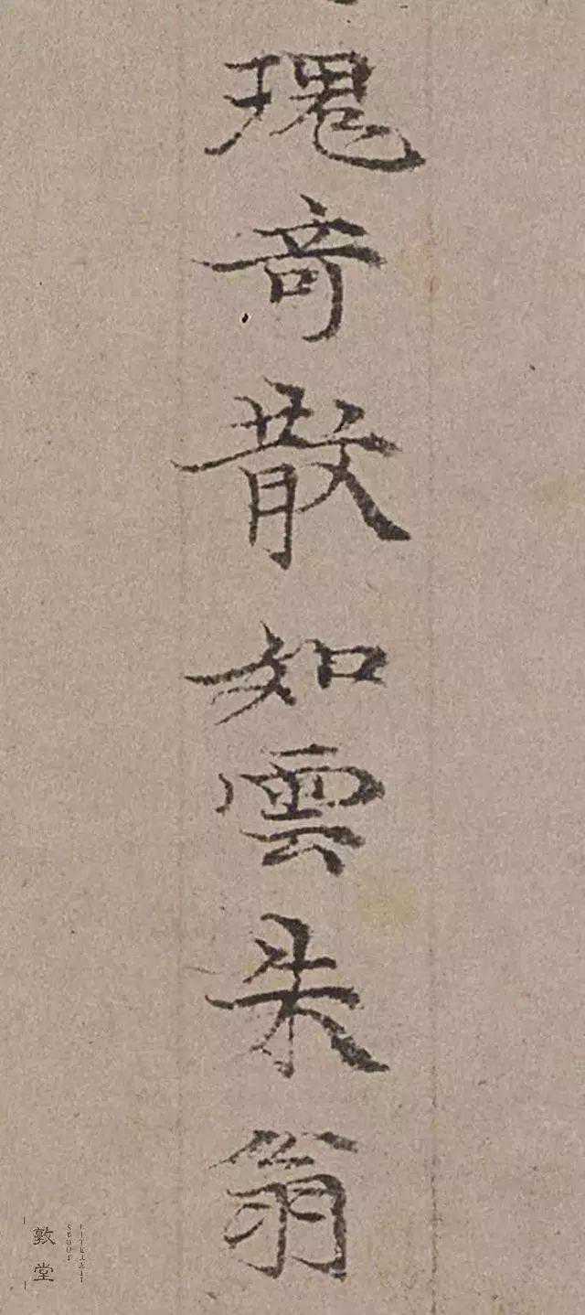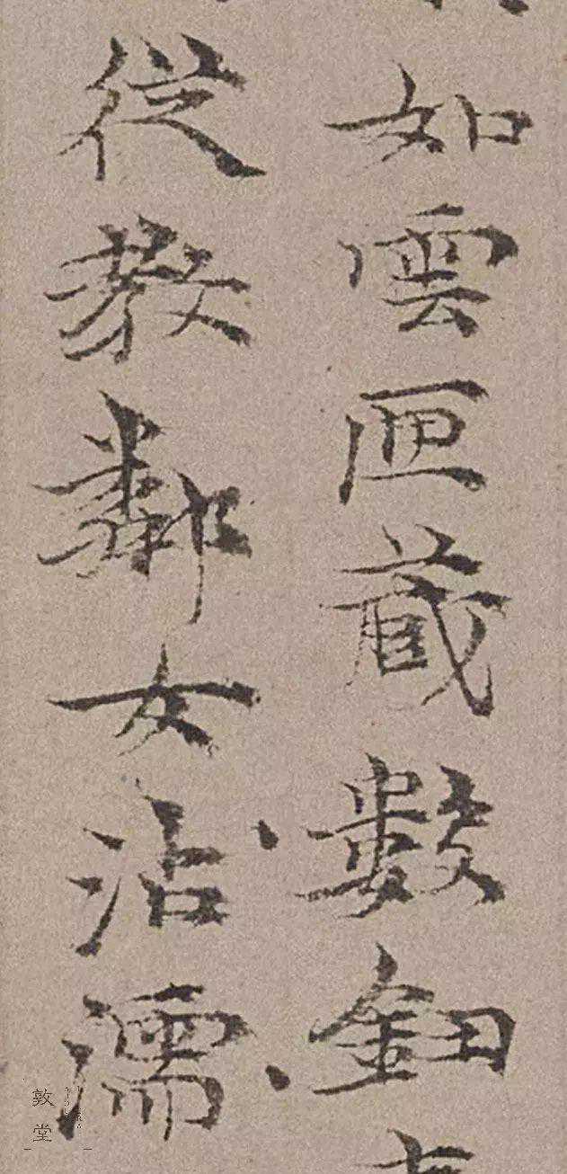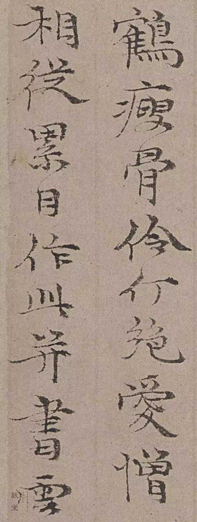 倪瓒小楷在处理撇、捺、卧钩、反捺等笔画时,有意将其角度变小,呈横向状态,增加了字形的横向感和节奏感,结构也更加稳定。同向线条的优点很多,但不易变化,可将撇、捺、竖、钩等笔画加长,造成疏密的强烈对比,徐渭曾说倪瓒的小楷“密而疏”,也即此意。同时还要注意横画的平、仰、覆的变化,不能将横画写的千篇一律。倪瓒小楷用单线勾出来,可看出其对笔画大多为曲线,长横多呈倒“S”形,竖画相背取势也为曲线,大多数笔画起笔处的顿笔无形中也增加了曲线等,从而打破了横强纵弱的僵化局面,使字体增加了一种“妩媚”的感觉。