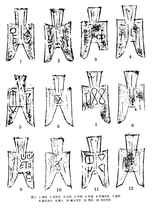 布币中文字种类很多,详细情况见附表。总的情况是大尖足布仅有8枚,上面文字有甘丹、大阴两种。多数是小尖足布,文字有:兹氏、平周等23种,近乎方足布形式的数量甚少,文字有:兹氏半、大阴等六种(图六:6、7、11、12)。