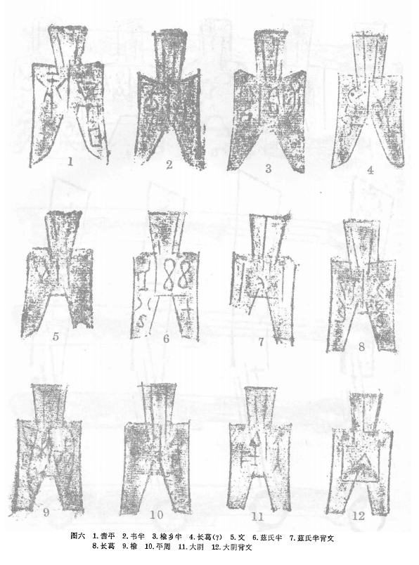 3.另有一种很相近方足布的形式,不过仍保留了尖足布的痕迹(图六:6—12、七:1、2)。在这些不同大小和形式有差别的尖足布中,首部都有两道直纹,布身中间一道,文字分布在直纹的两侧。布背又为首部一道,布身两道分布在两侧,并均直通至足。有的中问有数字。