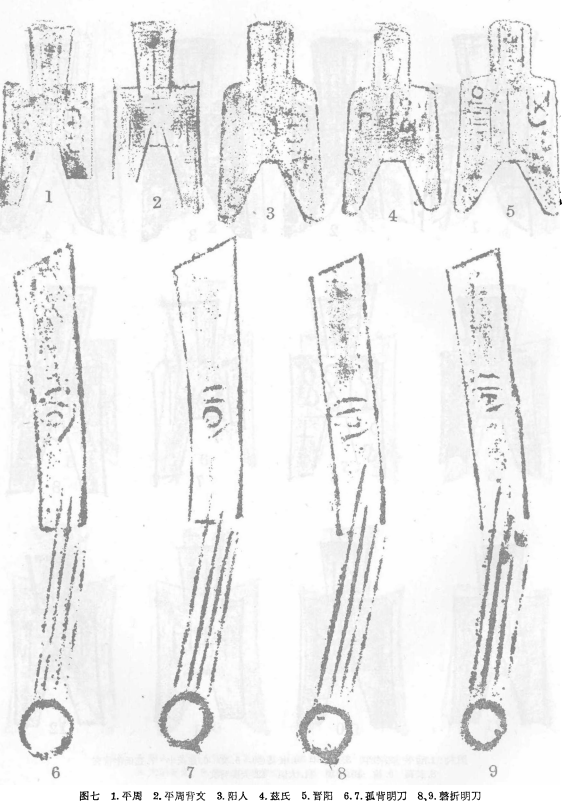 折背刀币的正面都有一明字,即以往著录中所称之明刀,但弧折刀上的明字写法是斜形的,磬折刀币上的明字又变为平目形。过去有些人认为可能是时代早晚的不同,而有所变化,或者是产地不同而形式有异。但其究竟,还有待今后发现来证实。折刀背面也有左、右、上、下或数字等不同文字(图七:6—9)。