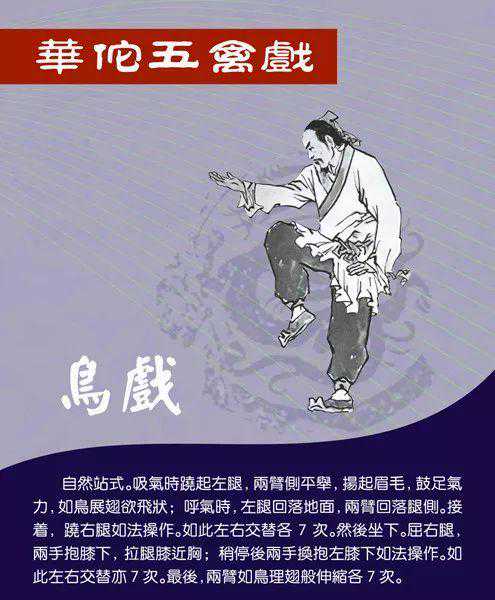 五行之中,鸟属金,与人体肺脏系统相对应,人体肺主身之气,主司呼吸,宣发水谷精微到全身各个部位。鸟戏模仿鹤的起落展翅、伸颈回顾,同时配合呼吸吐纳,能增强肺的呼吸功能。