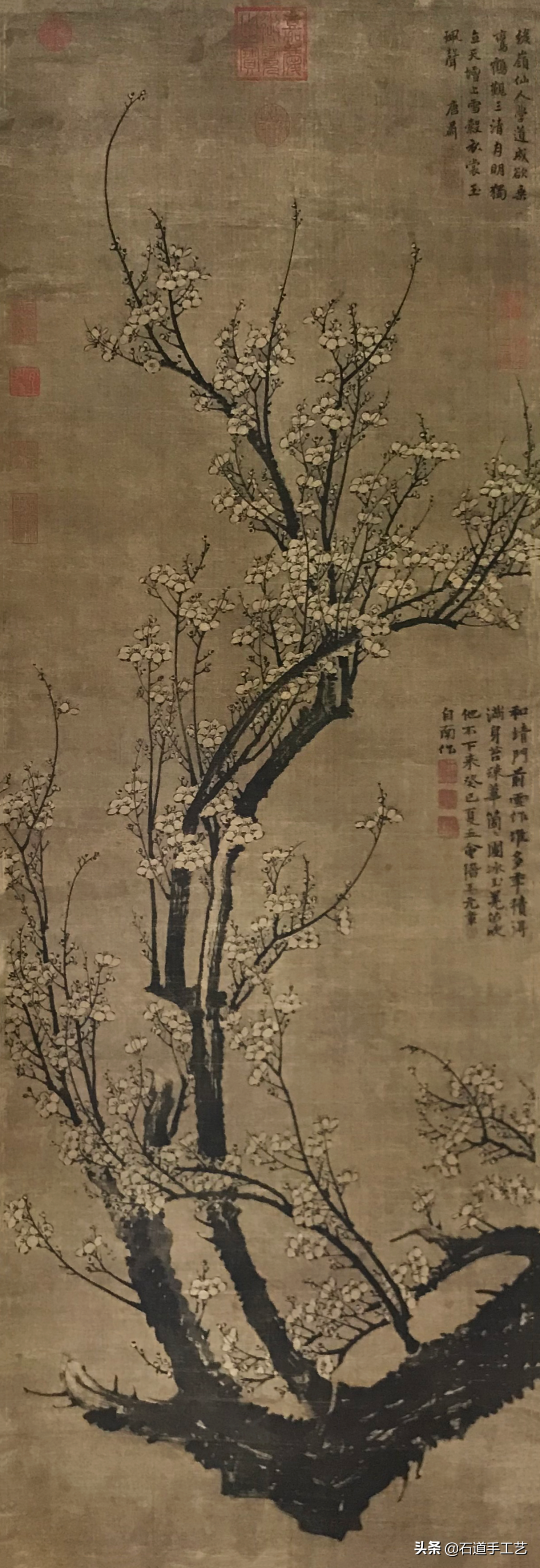 王冕(1287-1359),诸暨人。字符章,号煮石山农,饭牛翁。善竹石,学宋扬补之画风,尤工墨梅,自成一格。是轴为王冕晚年之作,老干屈曲横斜,枝条冲天上长,圈花点蔕如玉,笔力老辣劲挺。通幅千花万蕊,充满生气。