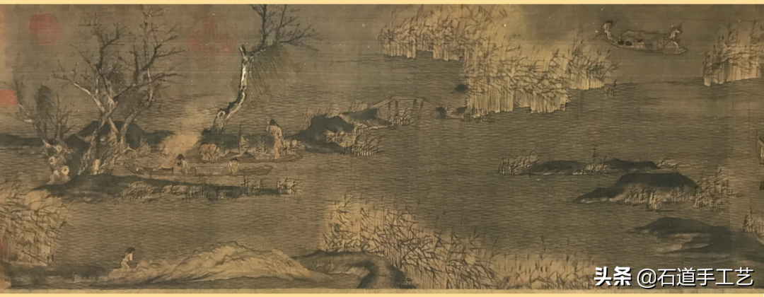 赵干(10世纪),江宁人。画善山水,为南唐李后主(李煜)画院学生。这卷写初冬江边渔作之景,全图以白粉弹雪,遂觉江天寒雪纷飞,将渔人艰辛作活情景描述殆尽。是目前传世作品中最早的一幅绢地山水人物并重之手卷画。