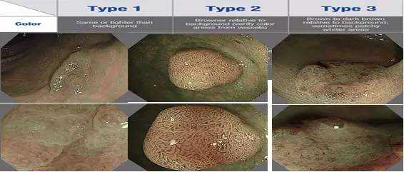 2.应当使用NBI观察每一枚息肉:推荐使用NICE系统(图19)判断息肉的性质,如果TYPE1型息肉,尤其是在直肠的小息肉,可以无需如何处理;如果是type2行息肉常规做活检或者行EMR或者ESD切除;如果是TYPE3型息肉,要使用放大NBI仔细观察,最好使用佐野宁的CP分型判断是粘膜层早癌还是粘膜下层早癌,以确定是行ESD切除还是行手术治疗。