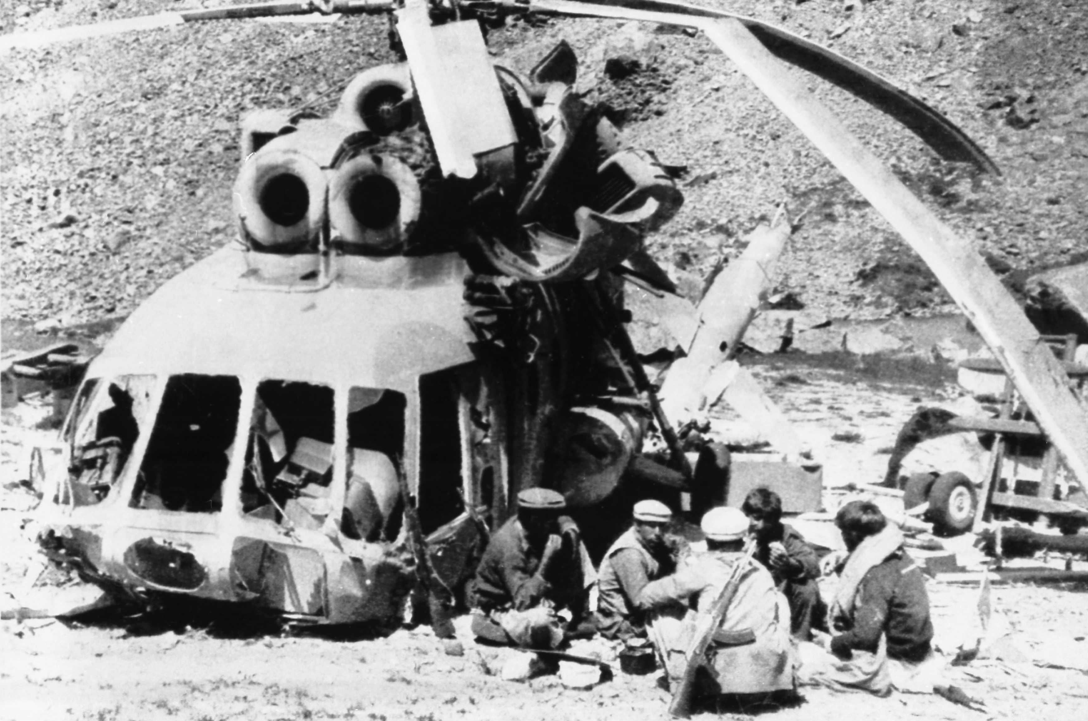阿富汗圣战者组织的士兵在被击落的苏军米-8直升机残骸旁休息。