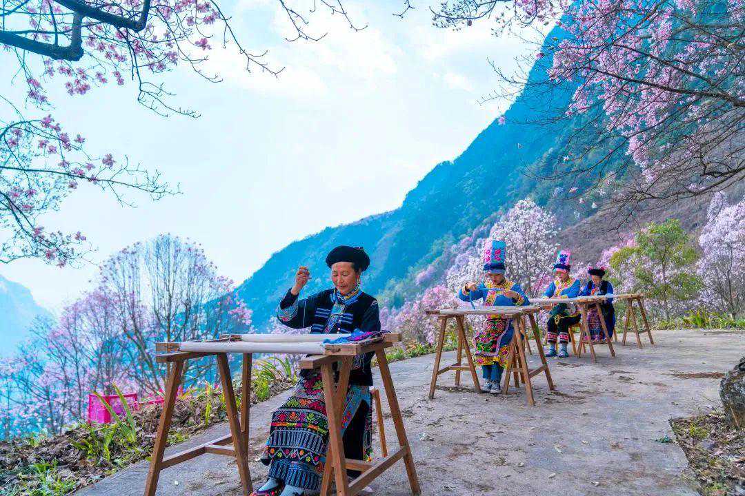 沿途而上,看羌绣展演,或是走上最高的观景平台,体会一览无余的辛夷花海,在此地围炉煮茶,享受在花海间的烂漫时光。