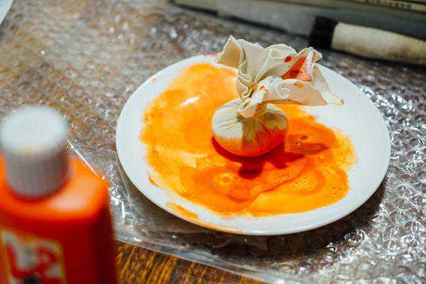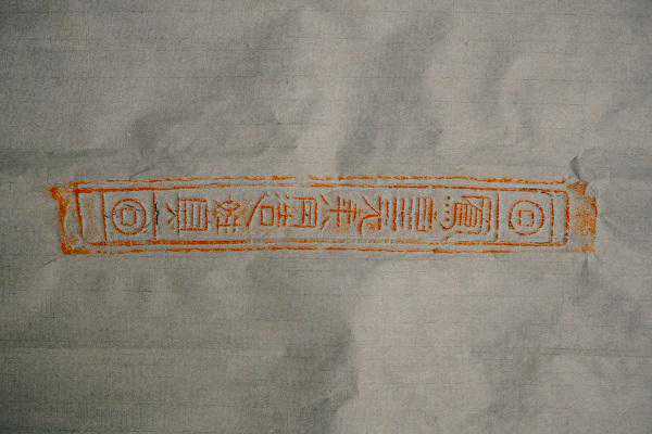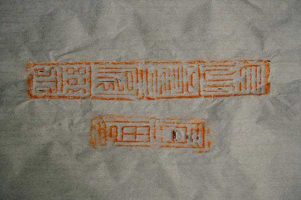宣纸干透后,用朱砂拓包蘸取朱砂或墨,为使上色均匀,先在废纸上轻轻拍打,至拓包显色合适均匀时,方可正式在宣纸上拓印;以拓包轻敲在宣纸上,文字逐步清晰即可;边缘部分动作,上色动作尤其要轻,不至于显色太厚,影响美观。