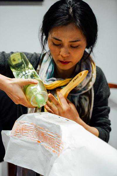 用毛刷轻轻敲打宣纸表面至印出文字轮廓与印记