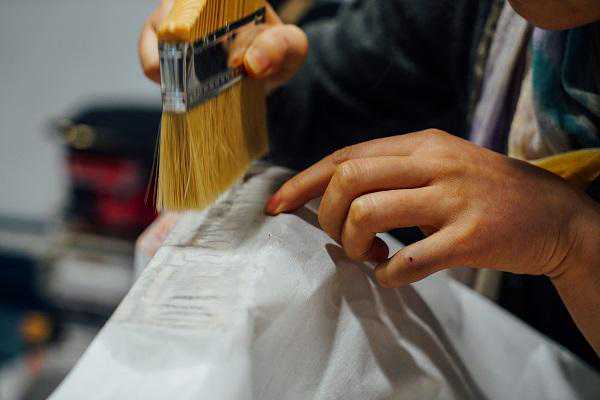 选择富有弹性,韧性好的宣纸,不易破损;将宣纸覆在古砖表面,用喷壶均匀喷湿。