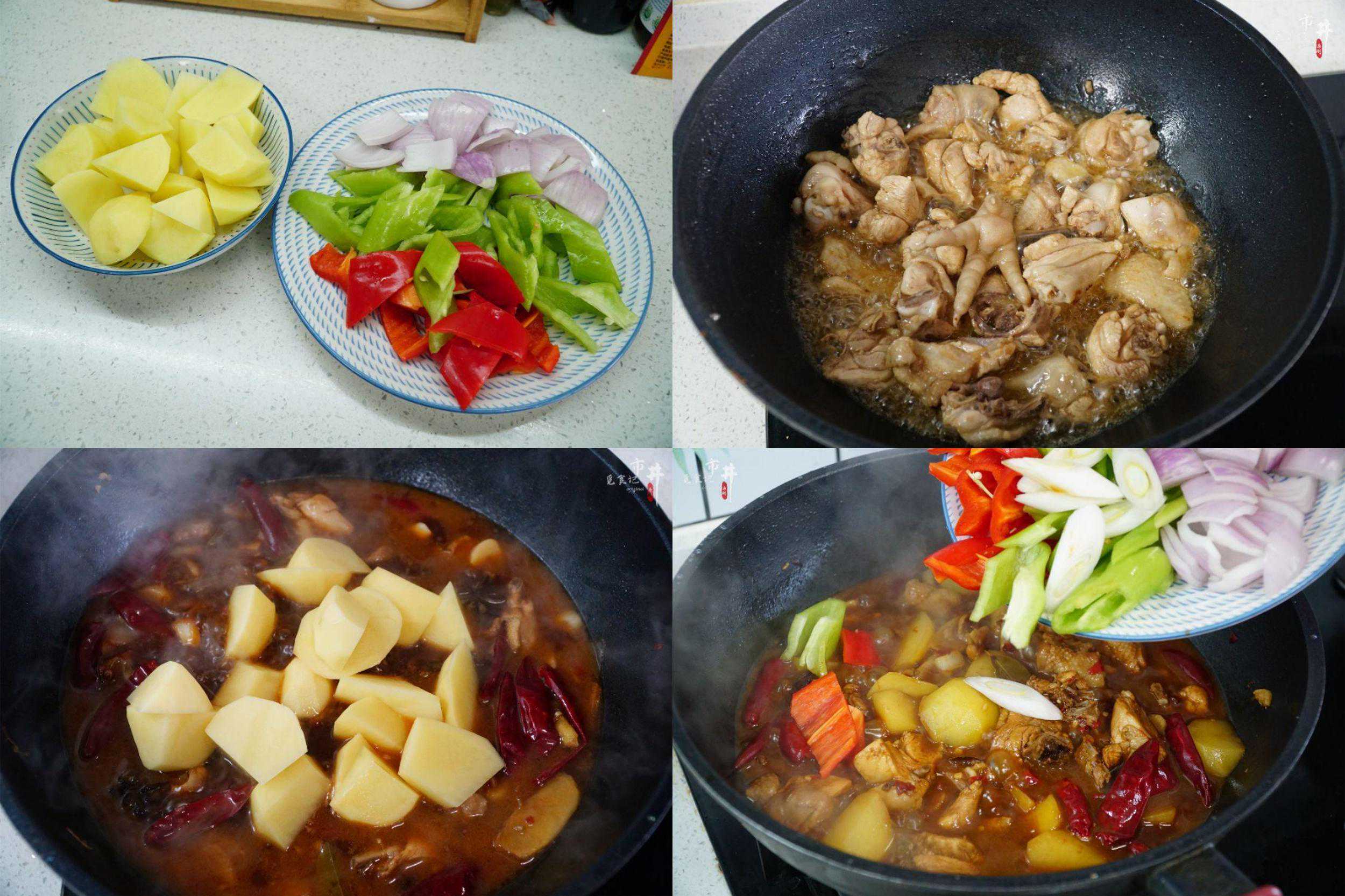 五、【大盘鸡】食材:三黄鸡、土豆、洋葱、青椒、红椒、大蒜、大葱、生姜、干辣椒、香叶、花椒粒、八角、草果、小茴香、桂皮、辣椒酱、白糖、生抽、老抽、胡椒粉、盐、味精