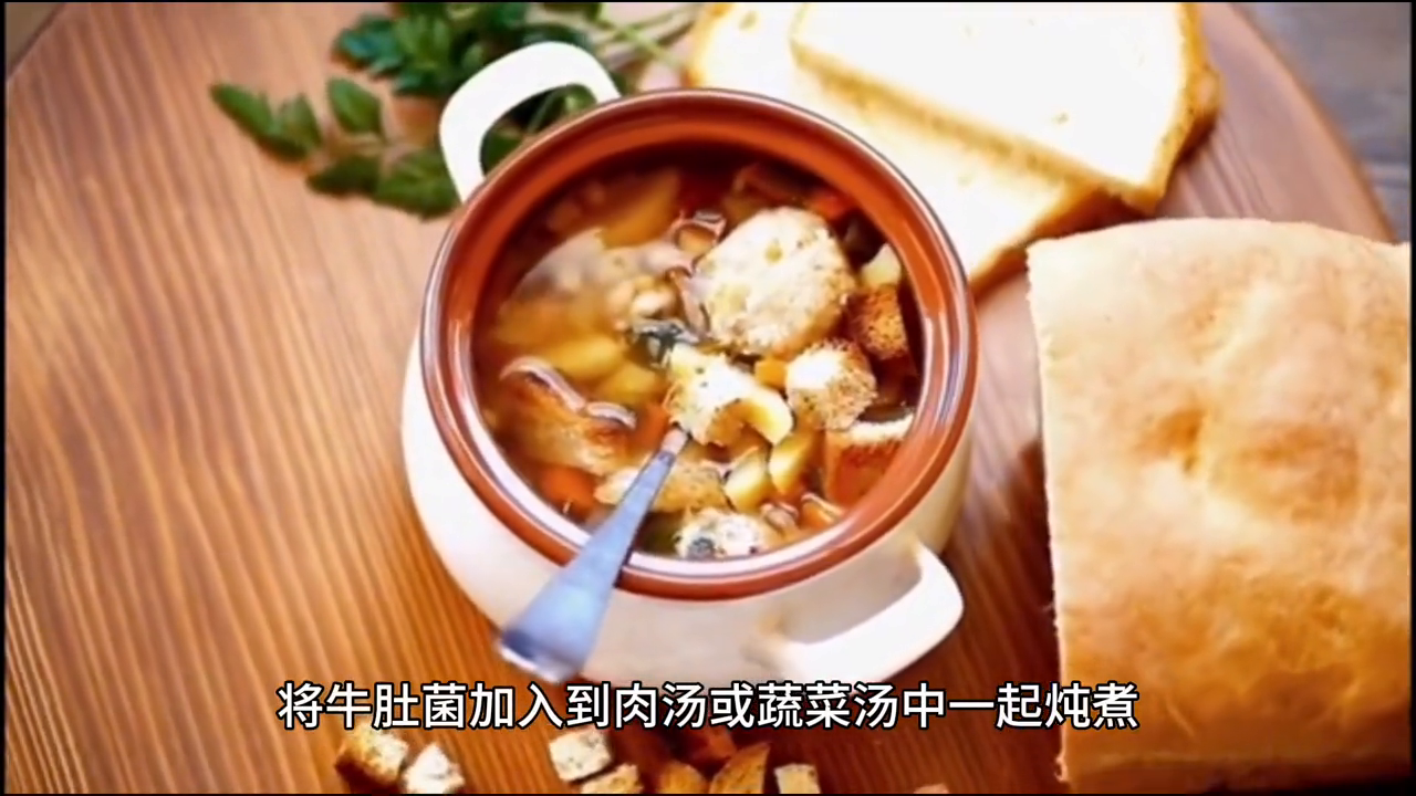 →2.炖汤:将牛肚菌加入到肉汤或蔬菜汤中一起炖煮,可以让汤的味道更加鲜美。同时牛肚菌中的营养成分也可以很好地融入到汤中让人体更易吸收,如牛肚菌鸡汤、牛肚菌蔬菜汤等都是非常受欢迎的汤品。