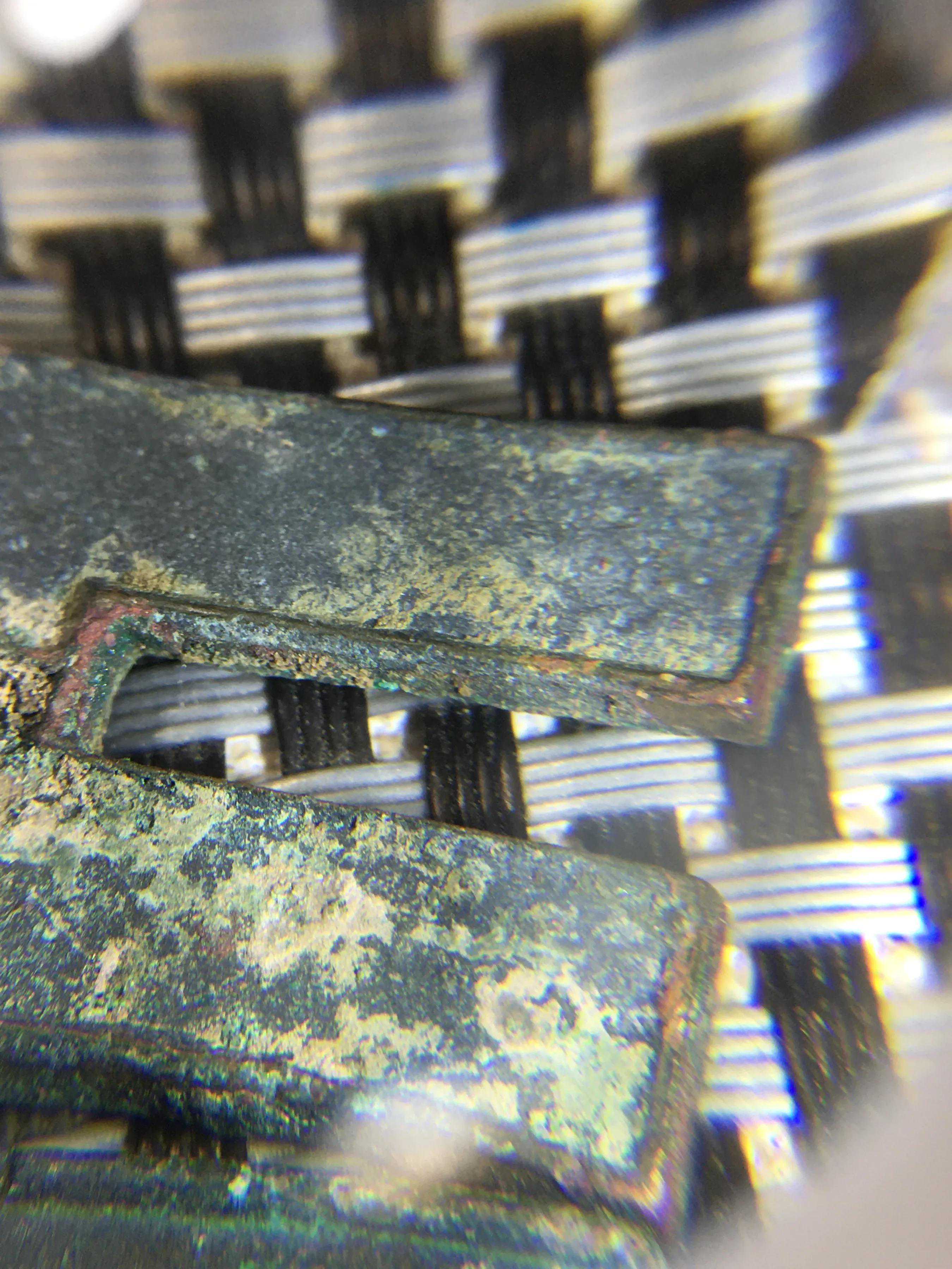左边这枚外延软肉,没有张力,拔模感太差!中间脱皮的地方明显看到锈迹的脱层!