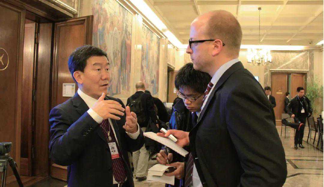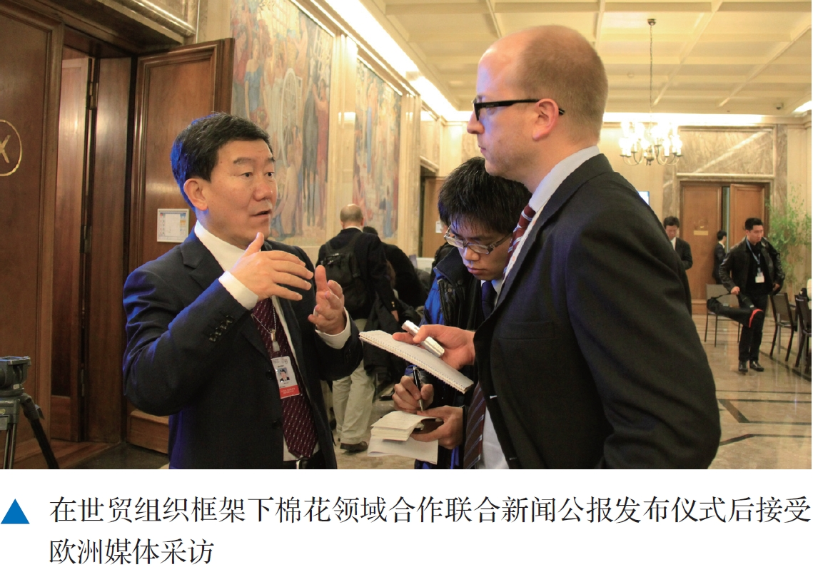△在世贸组织框架下棉花领域合作联合新闻公报发布仪式后接受欧洲媒体采访