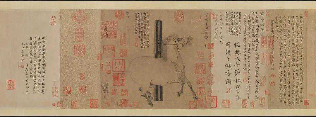 在同时人的作品上题诗文等等,大概是从汉代的图象赞上演变而来的。到北宋时渐渐盛行起来,如苏轼、黄庭坚、米芾等人往往为他们的朋友的作品题跋。当时他们虽不一定为了鉴定真伪而书,但到后代却成了极可靠的鉴定依据。例如:宋·李公麟《五马图》(无款印),本身上和后面尾纸上都有黄庭坚的题字;他们之间的友谊和黄的善鉴,我们是早已知道的,所以此黄庭坚题,等于李自书名款一样,甚至比李氏本款还要有用些,因为黄字我们见的比较多,可以比较,而李字少见,我们心中无数。