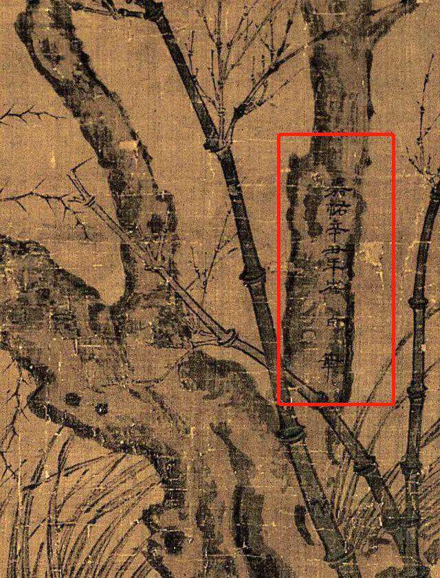 又黄筌《写生珍禽图》则是后添款,因为墨色浮在绢上。可靠的作者亲自书写名款、题记的,大量看到是在宋代以后。两宋绘画,所见写简单款识的有崔白、郭熙、李公麟、赵令穰、梁师闵、赵佶(徽宗)、李唐、刘松年、马远、马麟、夏圭等人,大都只写姓名、岁月几个字,至多加上一个图名。开始这些题款字写得很小,并且写在边角上或者树干、山石上等隐晦的地方(赵佶花押例外)。如崔白《双喜图》、李唐《万壑松风图》等。极少数如李公麟、李迪的画上,有写在画面上空隙处的。以长行大篇诗文题在卷后或轴中的,现在所见有南宋·米友仁、杨无咎、陈容、郑思肖、龚开、金·王庭筠等人。