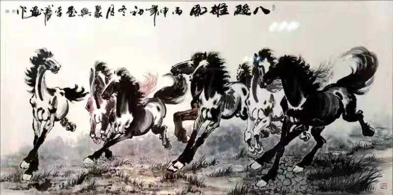 众多的书画题材中,李海山老师又对画马情有独钟且颇有造诣。古往今来擅画马的大师众多,李海山老师仅钟情于徐悲鸿和吴祖略的马。在李海山老师看来,徐悲鸿的马是将西方画的写实和中国画的笔墨意趣相结合,运笔老辣,淋漓校塞,马的立体感和质感凸出,显“稳”;而吴祖略的马墨渖肆意,极具妍姿,似有关塞纵横、冲风破雪之势,显“狂”。李海山老师将二者的技法和特质予以结合并融会贯通,同时辅以个人的创新,画出的马风姿飒爽,气势如虹,顺侧纵放,转换生姿,极具艺术感染力,不仅在业内好评如潮,屡次斩获专业级大奖,亦受到大众的追捧和称赞。