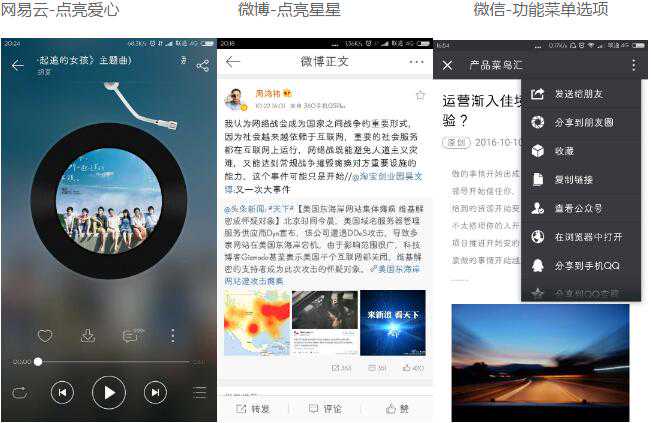 3-1添加确定了收藏的“最小单位”后,添加收藏的设计思路十分明朗,给每一个“最小单位”配一个便捷地添加方式,举一些香喷喷的栗子:
