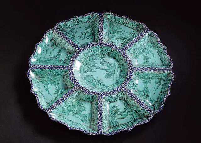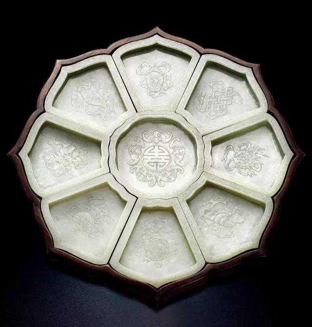 此后的雍正、乾隆两朝,中国古代的瓷器烧制工艺步入顶峰。瓷质攒盘也随之辉煌——珐琅彩、粉彩、青花等争奇斗妍的同时,还出现了铜胎画珐琅的攒盘。尤在乾隆一朝,更有玉质、紫砂质攒盘的出现。