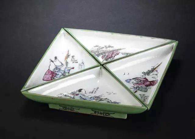 此件攒盘胎质纯净,釉色明丽,色彩巧妙,搭配自然。整体造型呈方形,由四件规格一致的三角形组件拼合而成。线条笔直,曲线优美,每盘皆绘人物、风景图画,件件画意不同,手法熟练,画面丰富,意境尽出,美观典雅。器底刻有“利永公司出品”款。