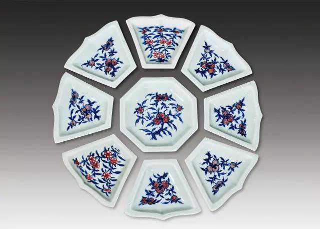 晚清民国时期的攒盘在形式上已较以前更加规范化和程式化,多为或方或圆的九子攒盘造型。方形器多以一主四副四边,圆形器多以一主八副两种形制。如方形器的排列是由从里到外二到三层大小渐变、方向不同的梯形组成,最里层是一个方形的主盘,第二层由四个梯形的副盘围绕主盘组成,第三层叫做边盘,为紧扣副盘、形体较大的四件梯形盘。四件边盘还有一个较独特的设计,即四个直角都被处理为“凹形”委角,它可有效地避免直角变形的可能,更为拿取攒盘留出手指拿捏的必要空间。这一处理形式被广泛地应用到方形的九子攒盘中,也说明了对这种独具匠心设计的认可。