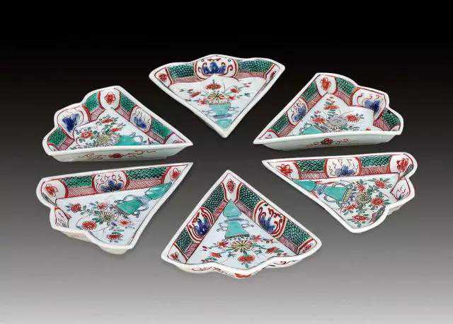 在装饰手法上,除见有明末流行的青花及青花五彩攒盘的制作外,清康熙朝还增添了五彩描金攒盘、色地三彩攒盘和素三彩攒盘等;式样更是有圆有方、有花有叶,如六方、八方以及梅花、葵花、菱花、莲瓣、花叶等诸多版本;制作也突破了各小盘不能移动的遗憾。留世的康熙攒盘精品,当属现藏于中国国家博物馆的清康熙景德镇窑五彩描金花蝶纹攒盘。